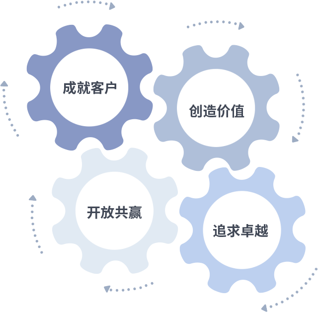 成就客户是一切决策的出发点,创造价值是衡量所有工作的标准,追求卓越是通宝TB888做事做人的态度,开放共赢是通宝TB888的格局也是最终的结果。价值观的齿轮环环相扣,推动着组织里的每个人不断向前。